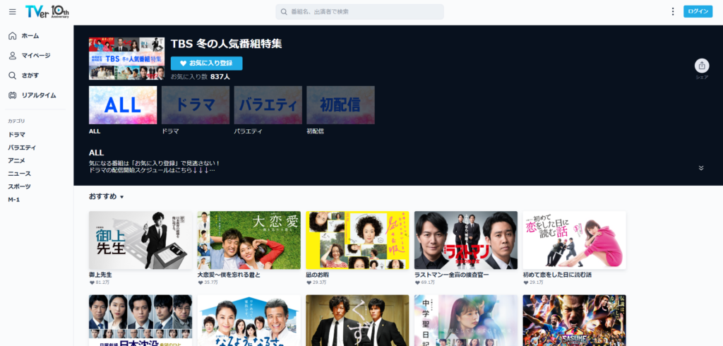 地上波で放送されたドラマやバラエティ番組を、放送後一定期間、無料で視聴できます。
